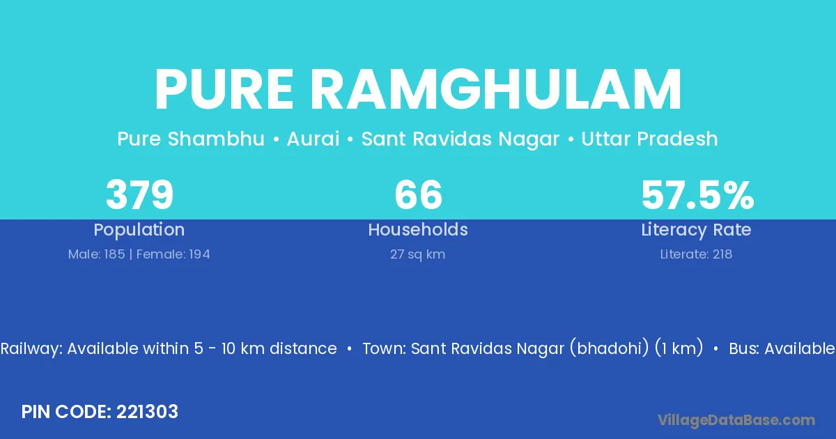 Sant Ravidas Nagar (bhadohi) (1 km) is the nearest town to Pure Ramghulam village for major economic activities and is located approximately 1 km away.
