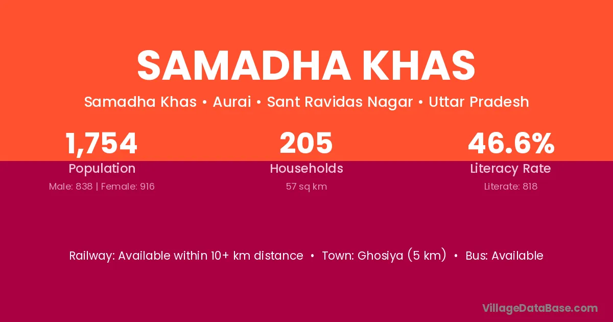 Samadha Khas village has a total population of 1,754 people, of which 838 are males and 916 are females.