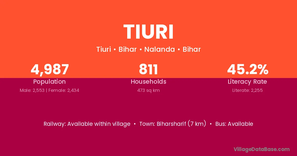 The literacy rate of Tiuri village is 53.82%. Male literacy stands at 62.72% and female literacy at 44.91%.