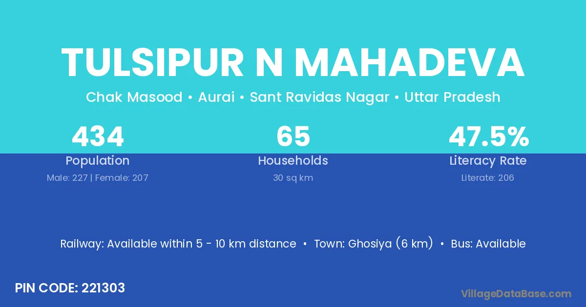 Ghosiya (6 km) is the nearest town to Tulsipur N Mahadeva village for major economic activities and is located approximately 6 km away.