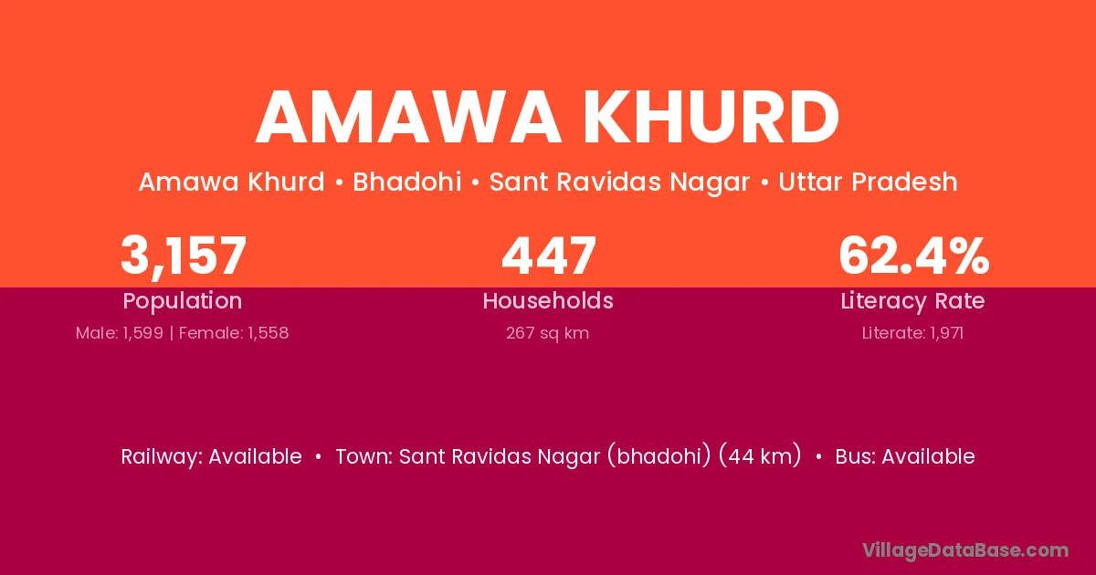 Sant Ravidas Nagar (bhadohi) (44 km) is the nearest town to Amawa Khurd village for major economic activities and is located approximately 44 km away.