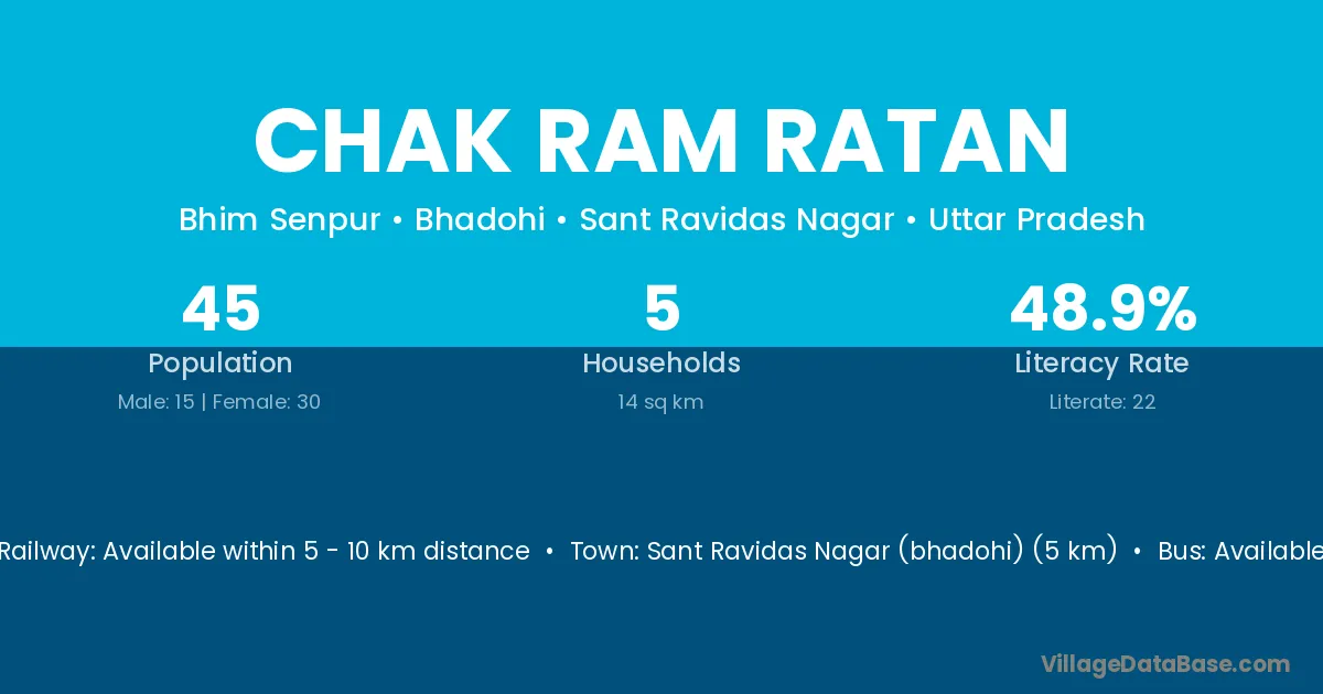Sant Ravidas Nagar (bhadohi) (5 km) is the nearest town to Chak Ram Ratan village for major economic activities and is located approximately 5 km away.