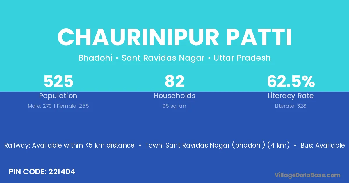Sant Ravidas Nagar (bhadohi) (4 km) is the nearest town to Chaurinipur Patti village for major economic activities and is located approximately 4 km away.