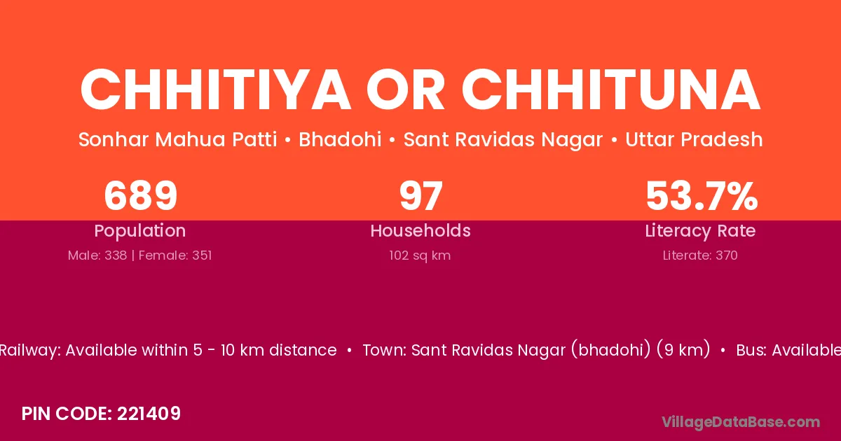 Sant Ravidas Nagar (bhadohi) (9 km) is the nearest town to Chhitiya Or Chhituna village for major economic activities and is located approximately 9 km away.