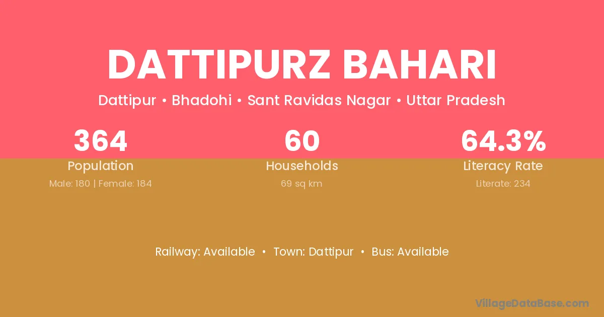 Dattipurz Bahari village has a total population of 364 people, of which 180 are males and 184 are females.
