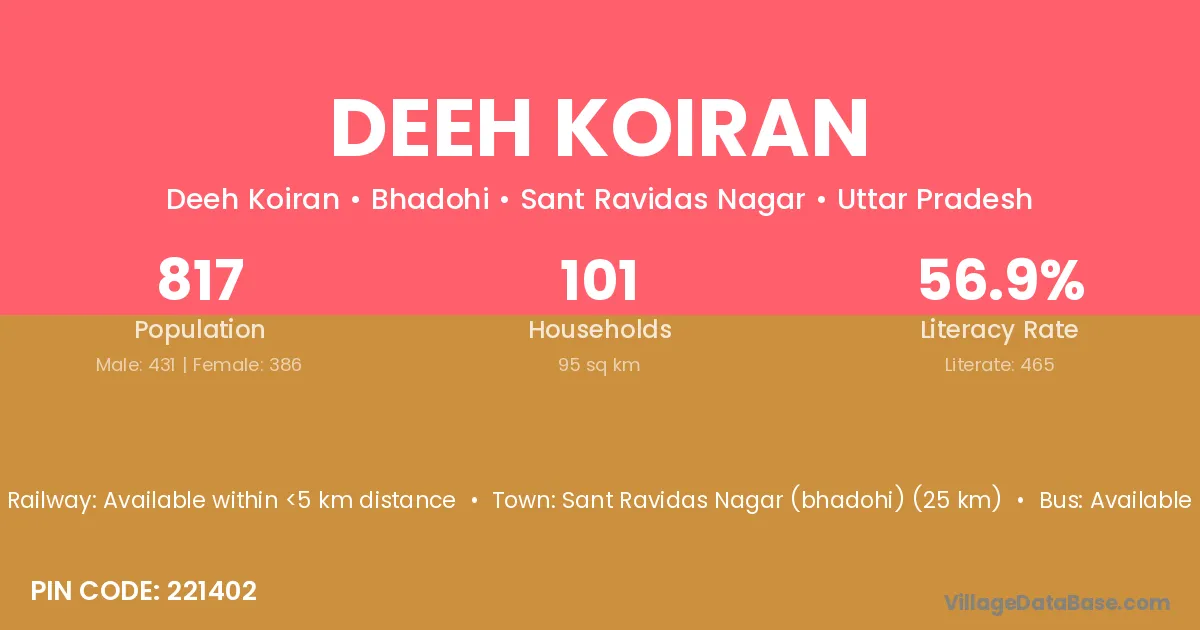Sant Ravidas Nagar (bhadohi) (25 km) is the nearest town to Deeh Koiran village for major economic activities and is located approximately 25 km away.