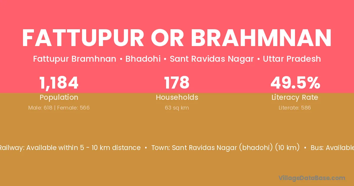 Sant Ravidas Nagar (bhadohi) (10 km) is the nearest town to Fattupur Or Brahmnan village for major economic activities and is located approximately 10 km away.