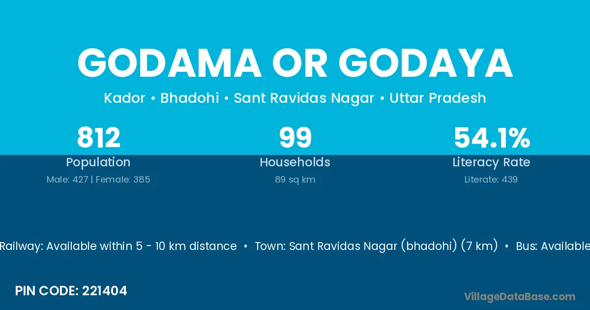 Sant Ravidas Nagar (bhadohi) (7 km) is the nearest town to Godama Or Godaya village for major economic activities and is located approximately 7 km away.