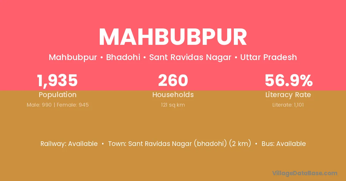 Sant Ravidas Nagar (bhadohi) (2 km) is the nearest town to Mahbubpur village for major economic activities and is located approximately 2 km away.