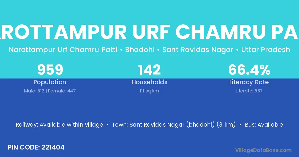 Sant Ravidas Nagar (bhadohi) (3 km) is the nearest town to Narottampur Urf Chamru Patti village for major economic activities and is located approximately 3 km away.