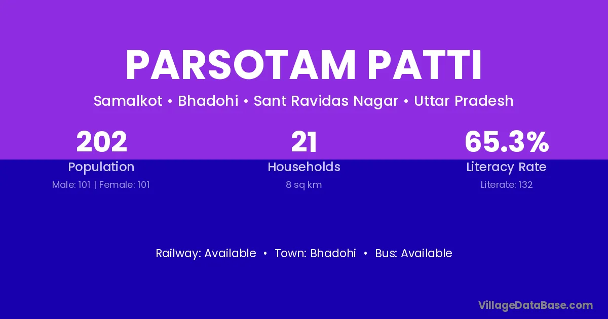 Parsotam Patti village has a total population of 202 people, of which 101 are males and 101 are females.