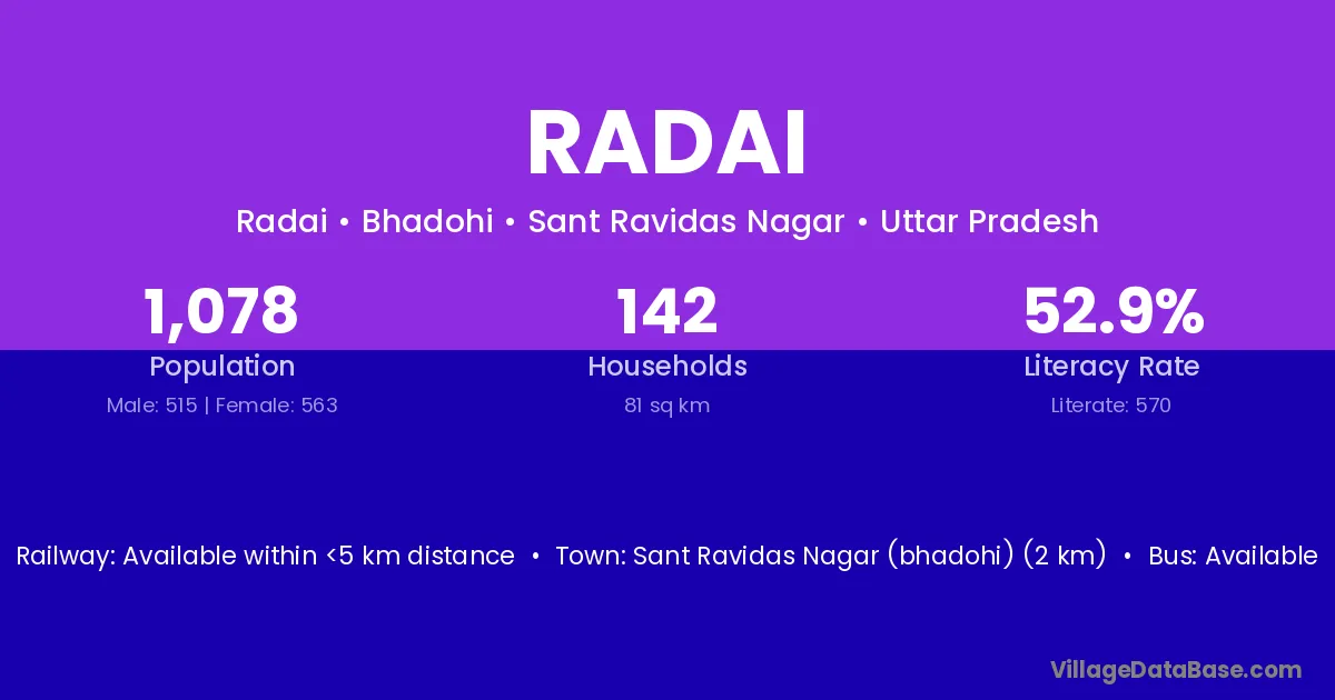 Sant Ravidas Nagar (bhadohi) (2 km) is the nearest town to Radai village for major economic activities and is located approximately 2 km away.