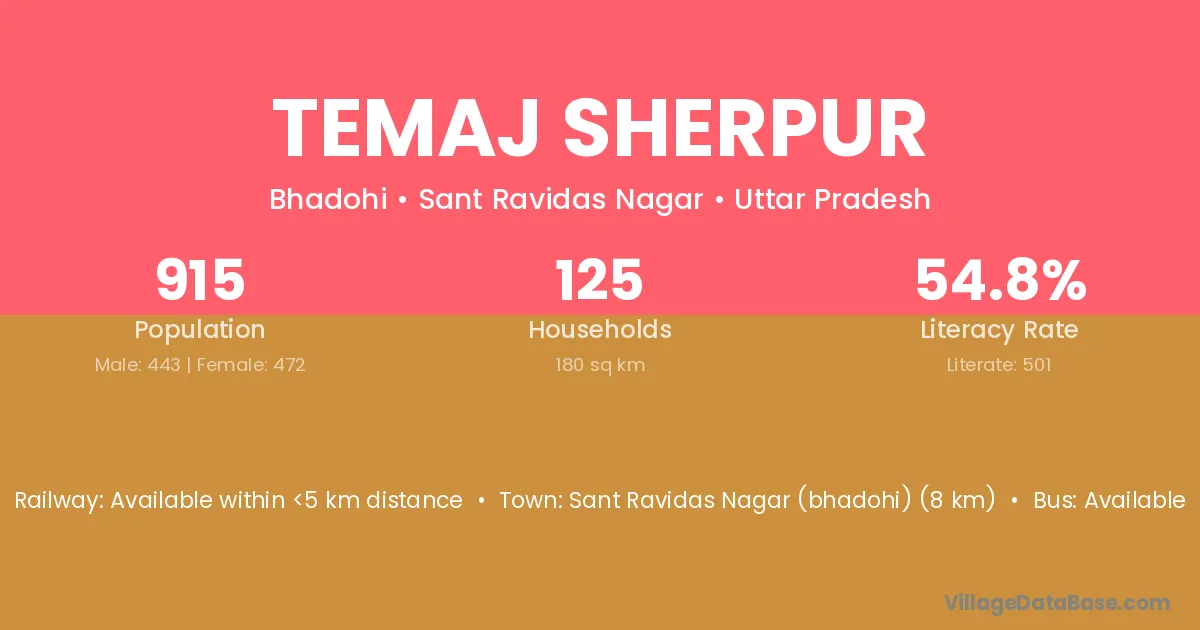 Sant Ravidas Nagar (bhadohi) (8 km) is the nearest town to Temaj Sherpur village for major economic activities and is located approximately 8 km away.