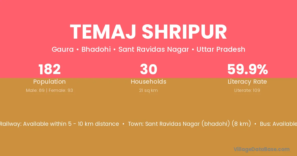 Sant Ravidas Nagar (bhadohi) (8 km) is the nearest town to Temaj Shripur village for major economic activities and is located approximately 8 km away.