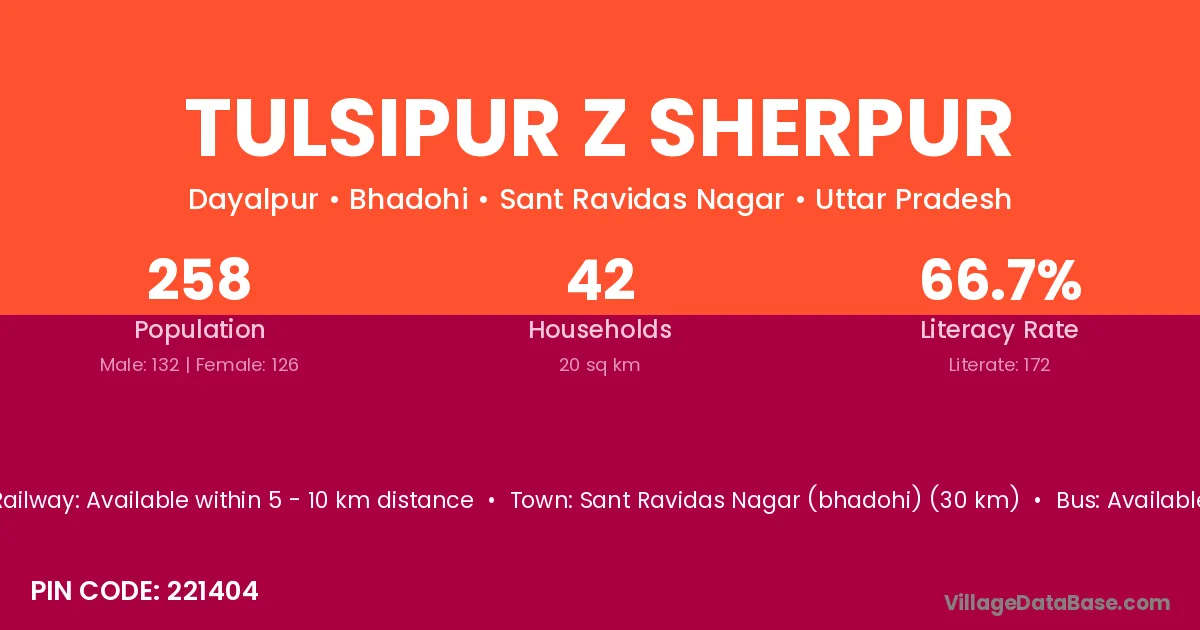Sant Ravidas Nagar (bhadohi) (30 km) is the nearest town to Tulsipur Z Sherpur village for major economic activities and is located approximately 30 km away.