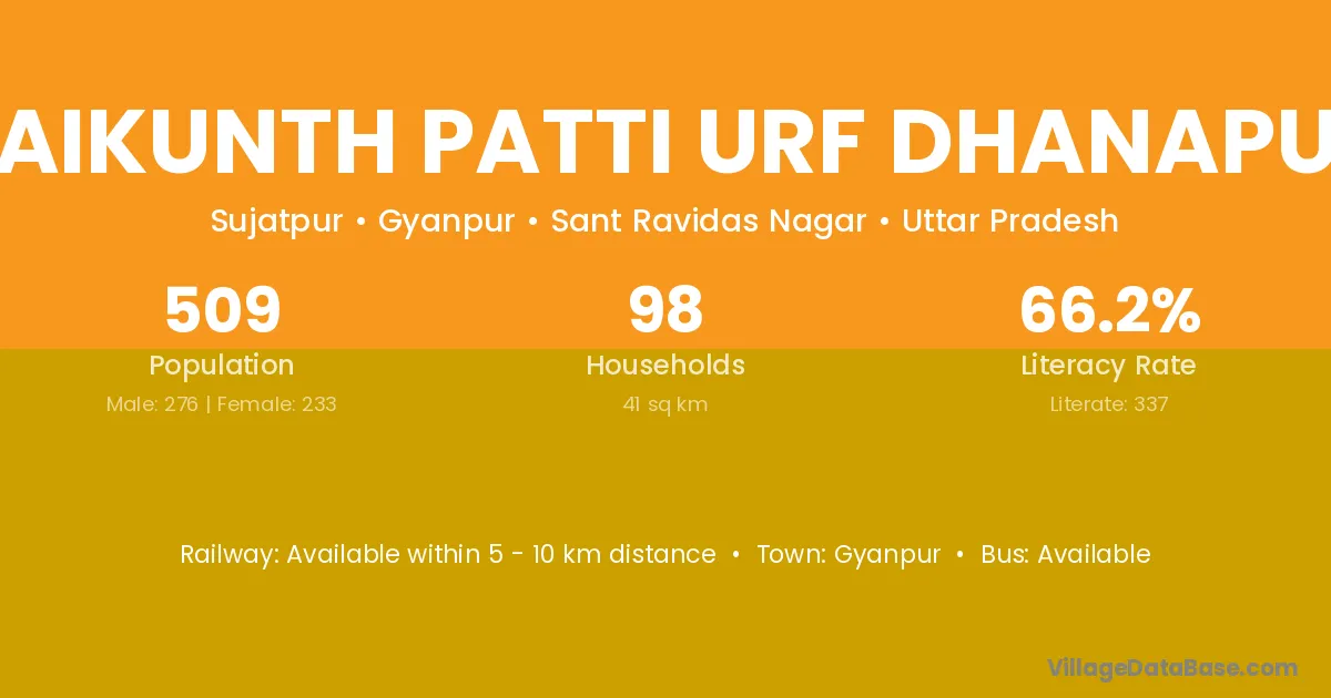 Baikunth Patti Urf Dhanapur village has a total population of 509 people, of which 276 are males and 233 are females.