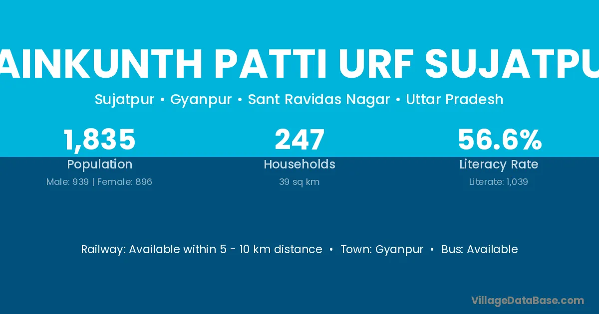 Bainkunth Patti Urf Sujatpur village has a total population of 1,835 people, of which 939 are males and 896 are females.