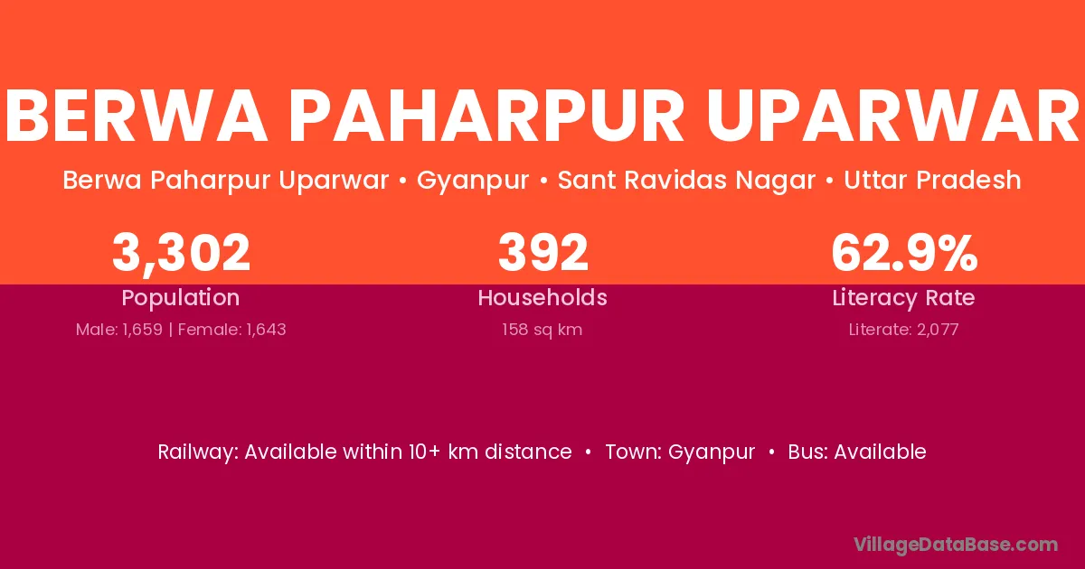 Berwa Paharpur Uparwar village has a total population of 3,302 people, of which 1,659 are males and 1,643 are females.
