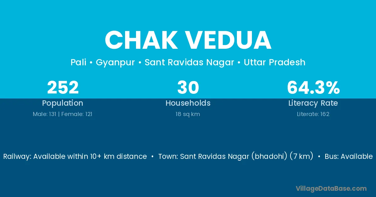Sant Ravidas Nagar (bhadohi) (7 km) is the nearest town to Chak Vedua village for major economic activities and is located approximately 7 km away.