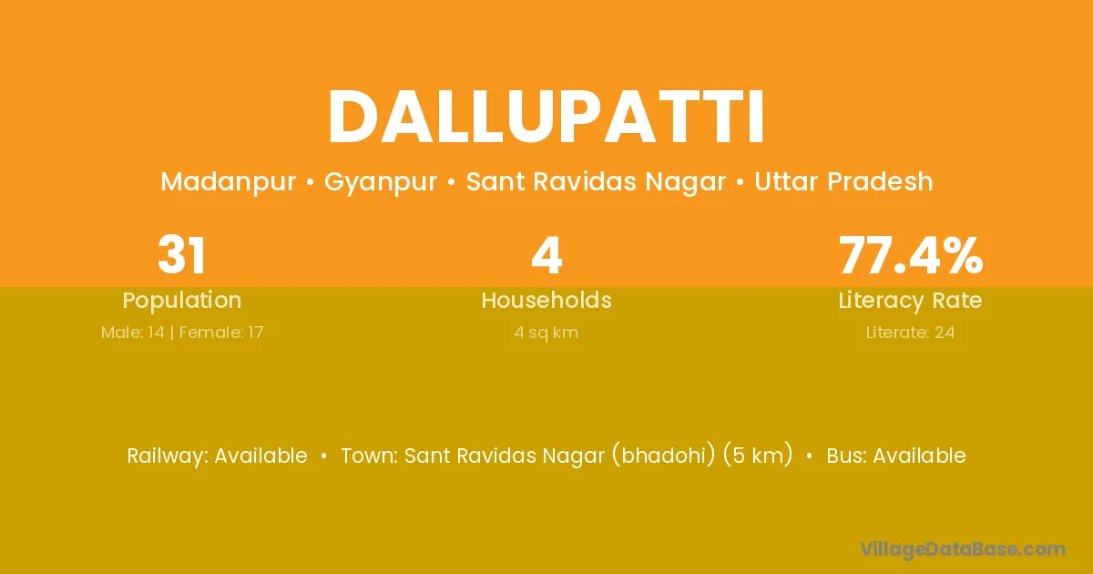 Sant Ravidas Nagar (bhadohi) (5 km) is the nearest town to Dallupatti village for major economic activities and is located approximately 5 km away.