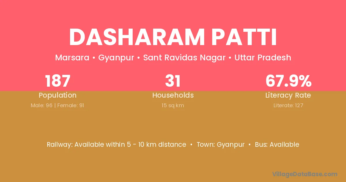 Dasharam Patti village has a total population of 187 people, of which 96 are males and 91 are females.