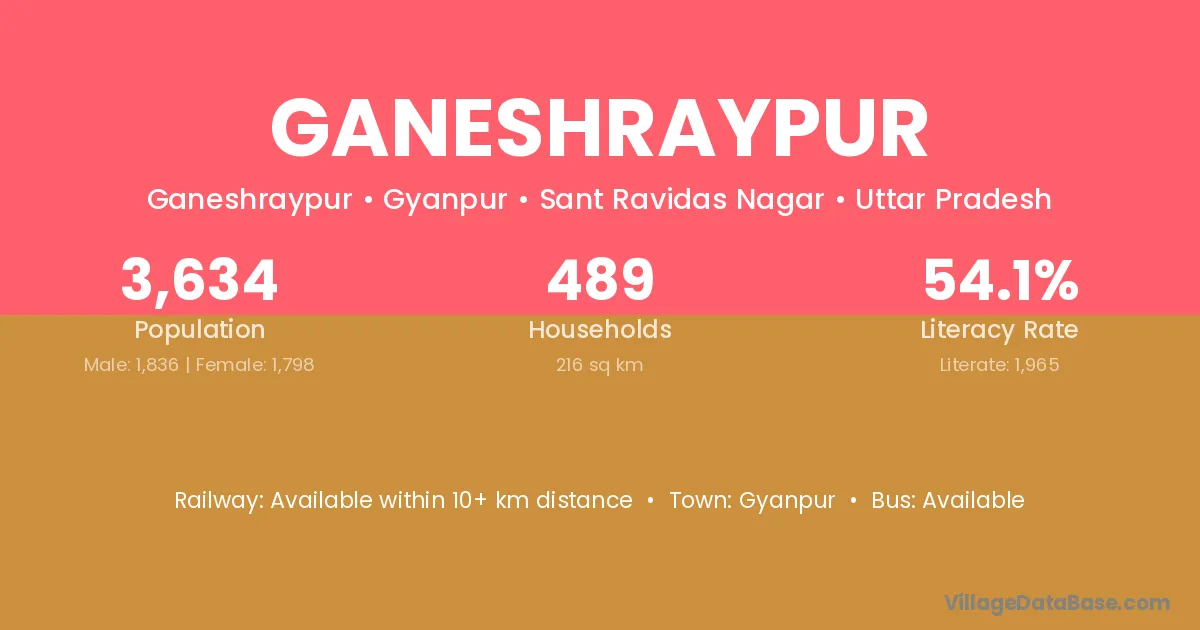 Ganeshraypur village has a total population of 3,634 people, of which 1,836 are males and 1,798 are females.