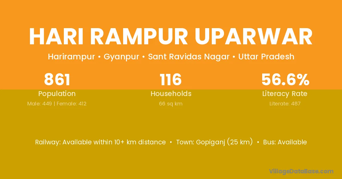 Gopiganj (25 km) is the nearest town to Hari Rampur Uparwar village for major economic activities and is located approximately 25 km away.
