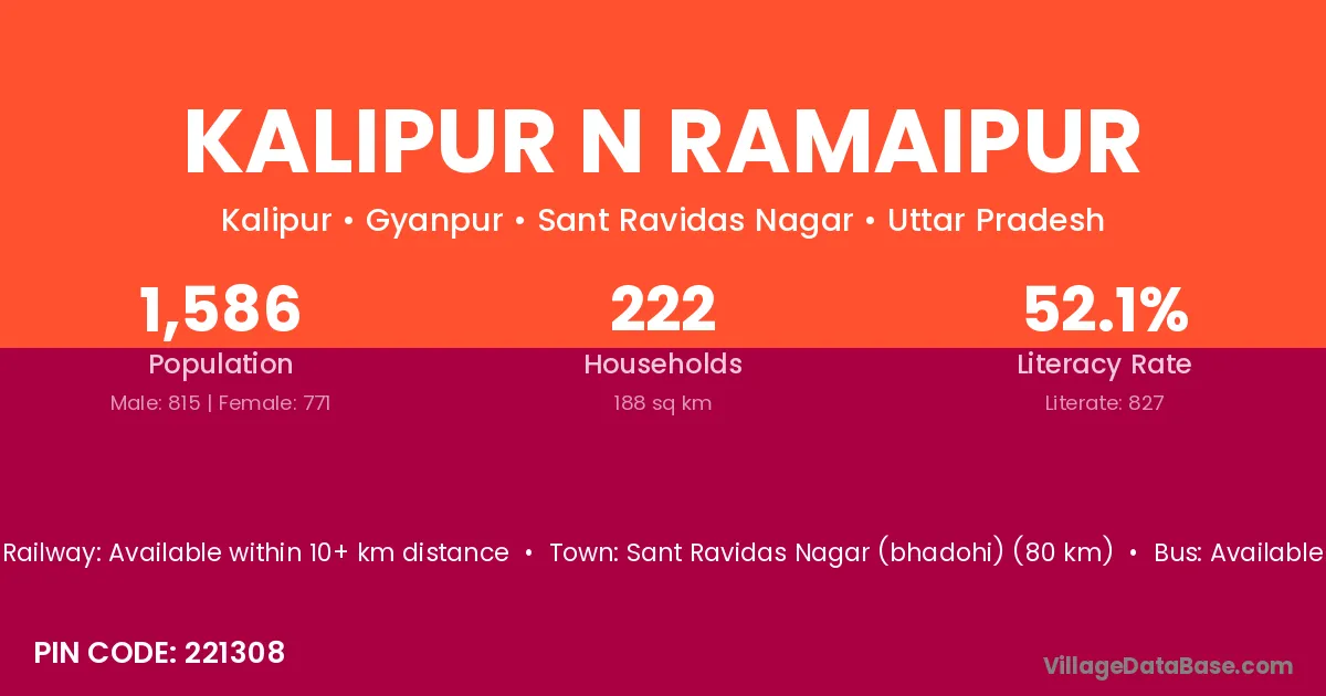 Sant Ravidas Nagar (bhadohi) (80 km) is the nearest town to Kalipur N Ramaipur village for major economic activities and is located approximately 80 km away.