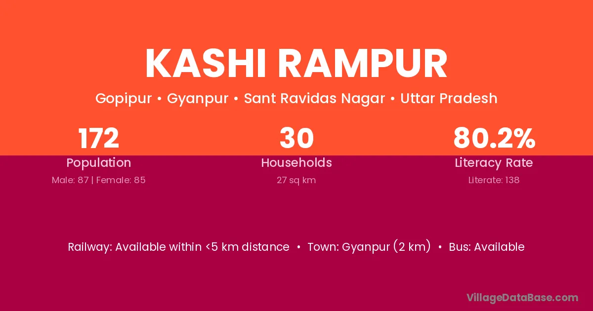 Gyanpur (2 km) is the nearest town to Kashi Rampur village for major economic activities and is located approximately 2 km away.