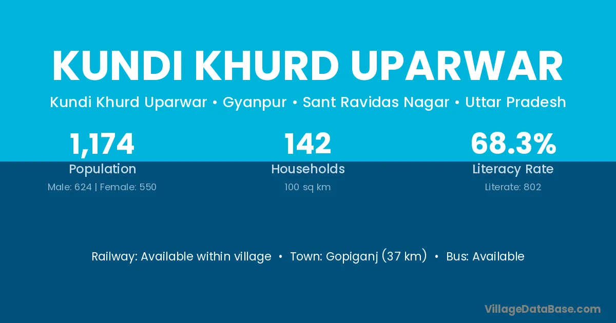 Kundi Khurd Uparwar village has a total population of 1,174 people, of which 624 are males and 550 are females.
