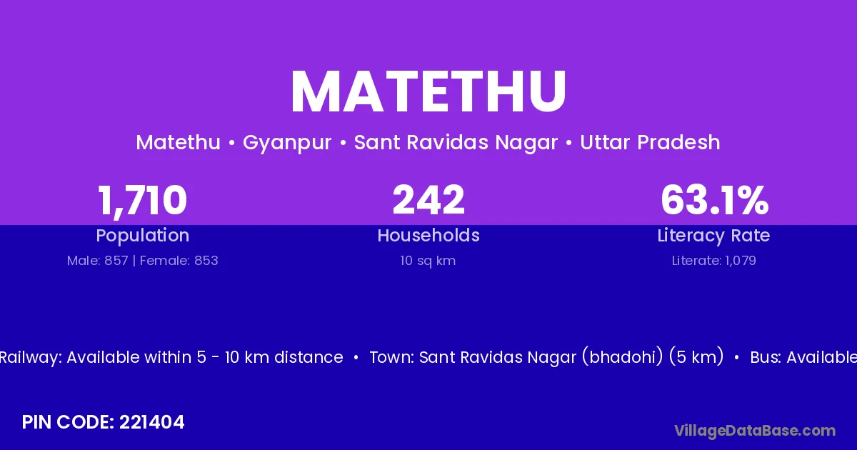 Sant Ravidas Nagar (bhadohi) (5 km) is the nearest town to Matethu village for major economic activities and is located approximately 5 km away.