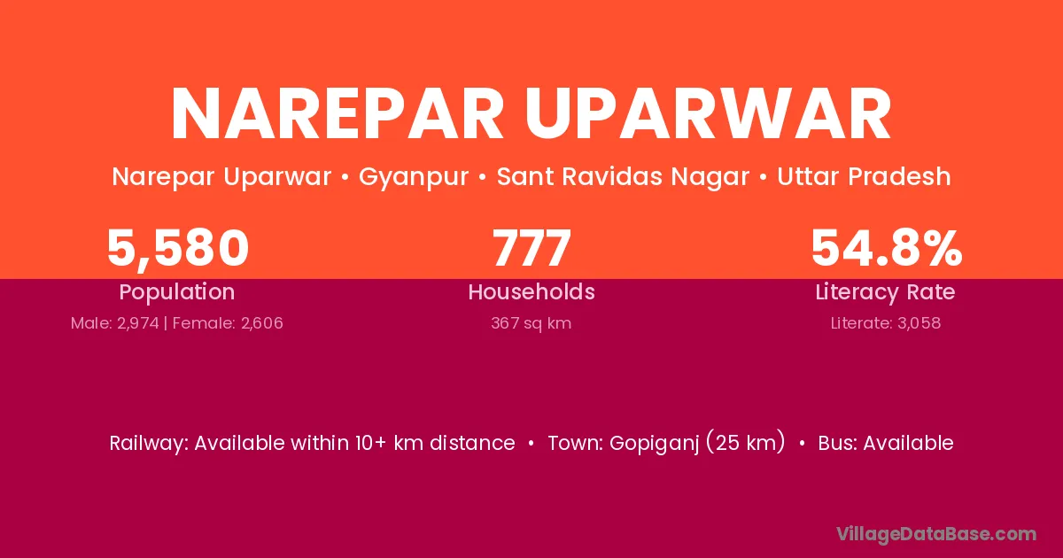Gopiganj (25 km) is the nearest town to Narepar Uparwar village for major economic activities and is located approximately 25 km away.