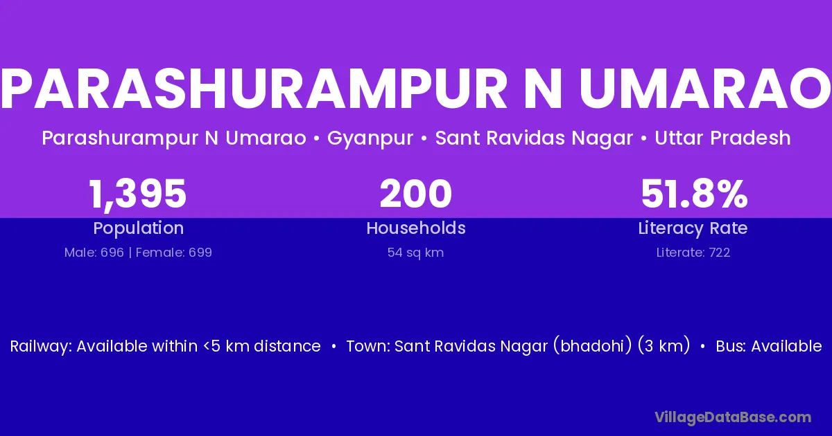 Sant Ravidas Nagar (bhadohi) (3 km) is the nearest town to Parashurampur N Umarao village for major economic activities and is located approximately 3 km away.
