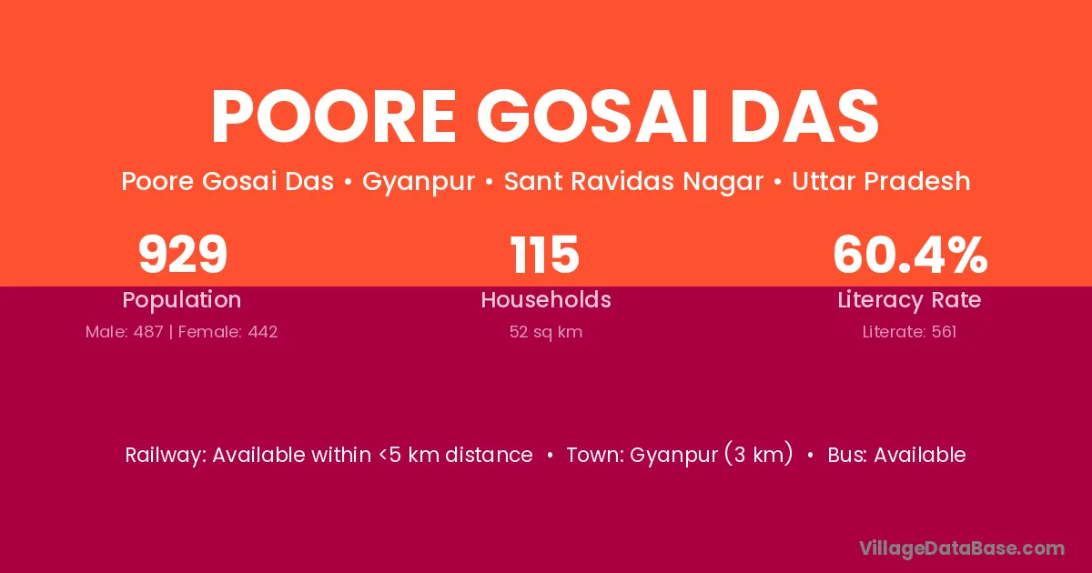 Gyanpur (3 km) is the nearest town to Poore Gosai Das village for major economic activities and is located approximately 3 km away.