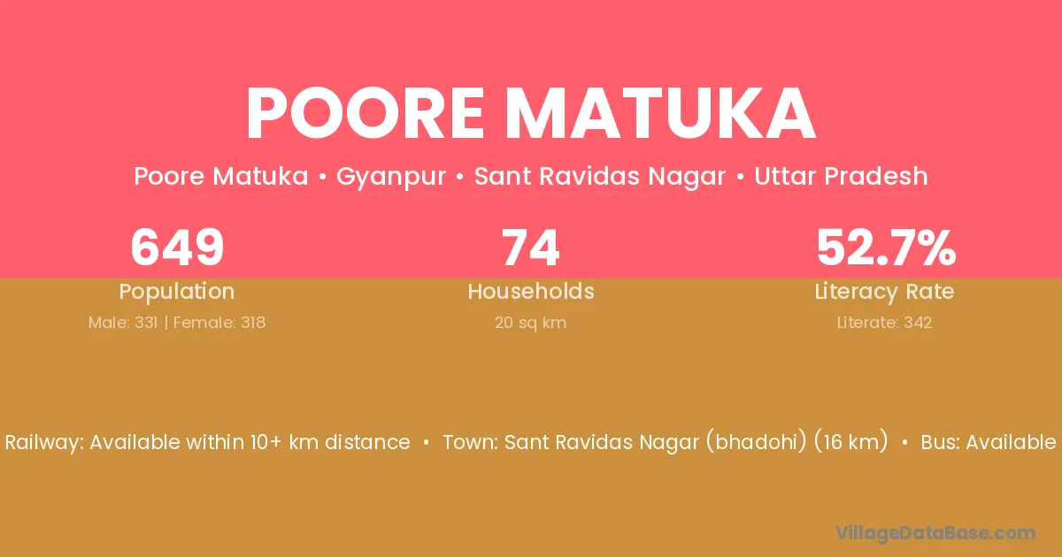 Sant Ravidas Nagar (bhadohi) (16 km) is the nearest town to Poore Matuka village for major economic activities and is located approximately 16 km away.