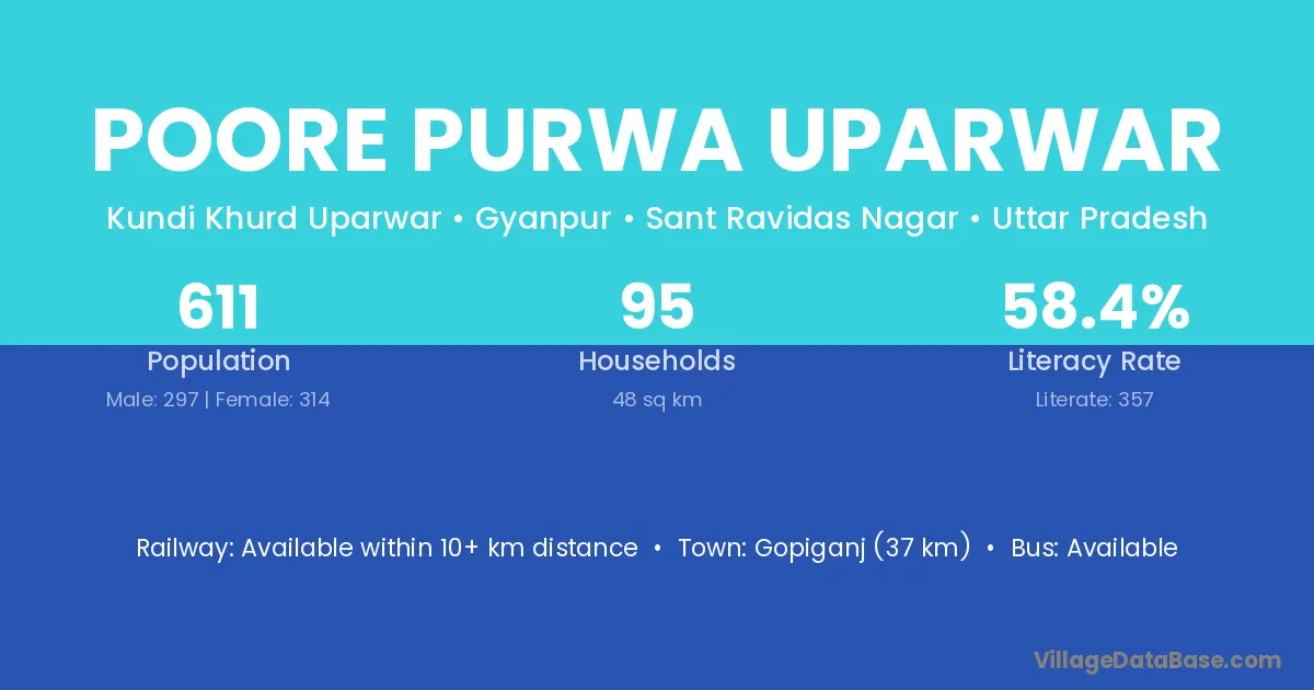 Gopiganj (37 km) is the nearest town to Poore Purwa Uparwar village for major economic activities and is located approximately 37 km away.