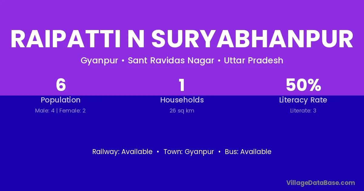 Raipatti N Suryabhanpur village has a total population of 6 people, of which 4 are males and 2 are females.