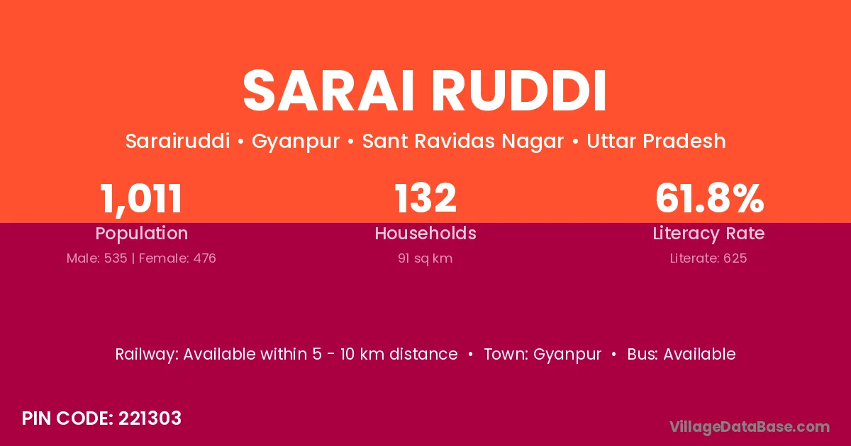 Sarai Ruddi village has a total population of 1,011 people, of which 535 are males and 476 are females.