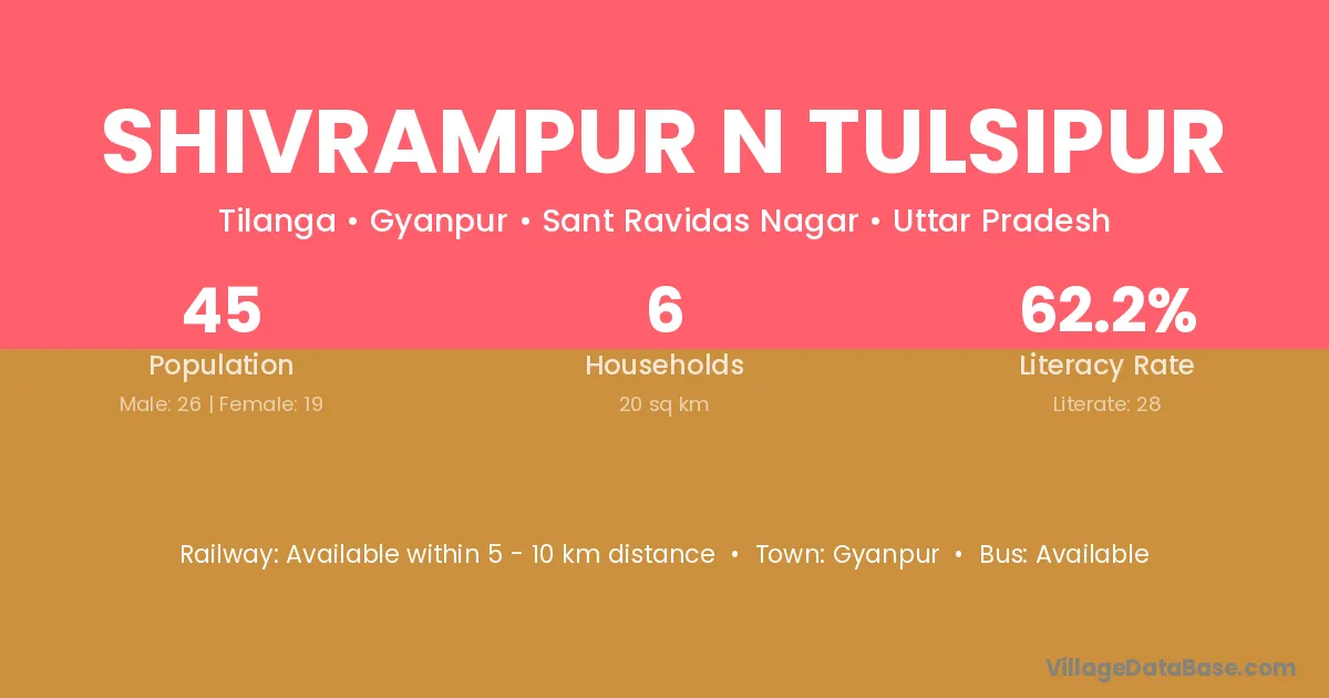 Shivrampur N Tulsipur village has a total population of 45 people, of which 26 are males and 19 are females.