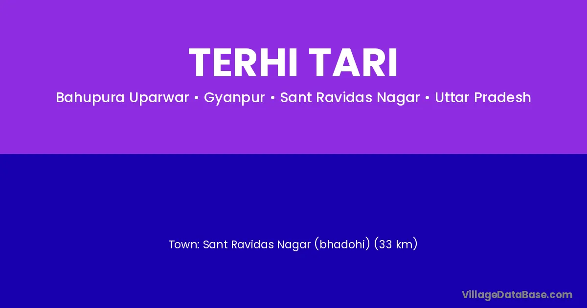 Sant Ravidas Nagar (bhadohi) (33 km) is the nearest town to Terhi Tari village for major economic activities and is located approximately 33 km away.