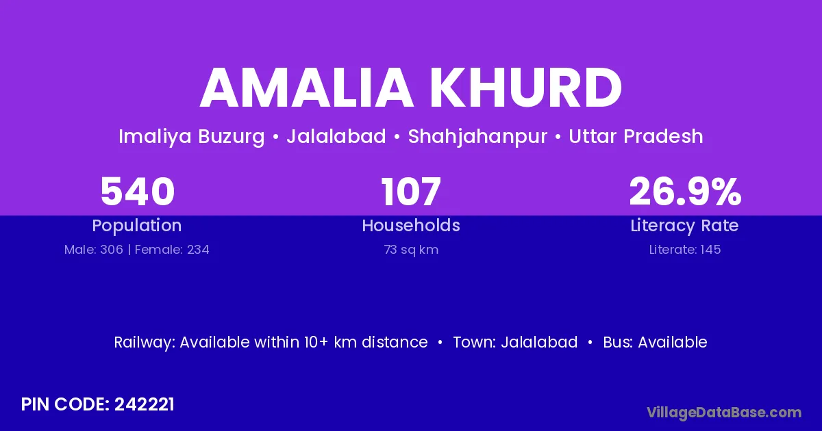 The literacy rate of Amalia Khurd village is 26.85%. Male literacy stands at 32.03% and female literacy at 20.09%.