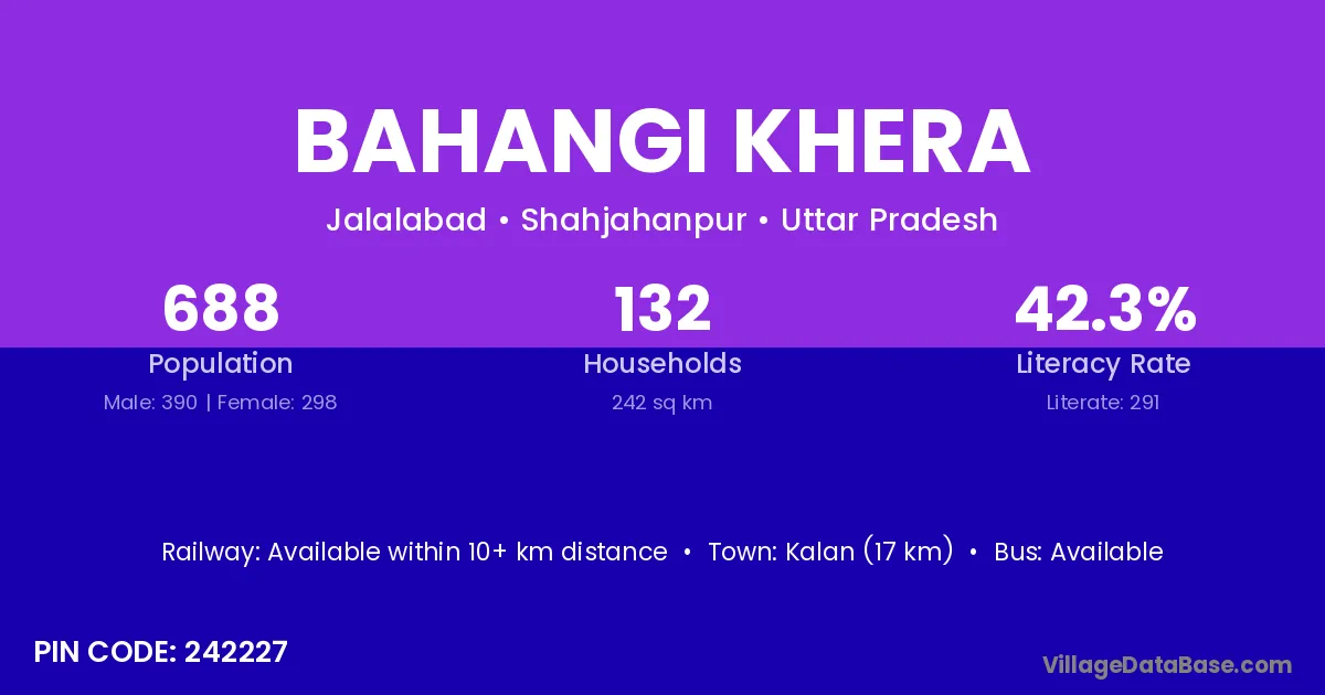 Bahangi Khera village has a total population of 688 people, of which 390 are males and 298 are females.