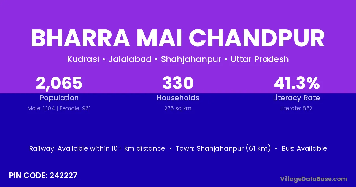 Shahjahanpur (61 km) is the nearest town to Bharra Mai Chandpur village for major economic activities and is located approximately 61 km away.