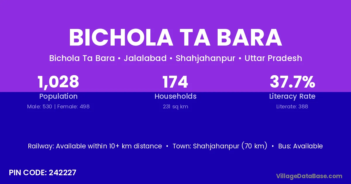 Shahjahanpur (70 km) is the nearest town to Bichola Ta Bara village for major economic activities and is located approximately 70 km away.