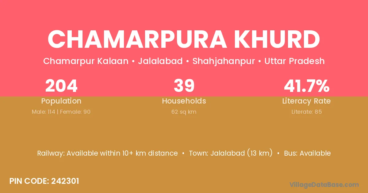 Chamarpura Khurd village has a total population of 204 people, of which 114 are males and 90 are females.