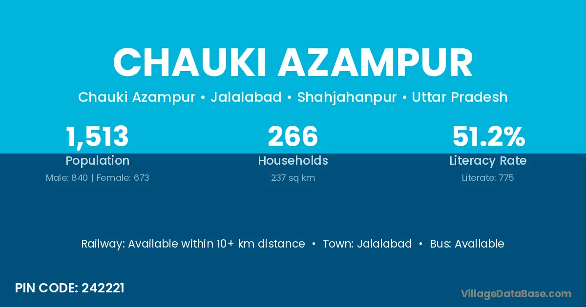 Chauki Azampur village has a total population of 1,513 people, of which 840 are males and 673 are females.