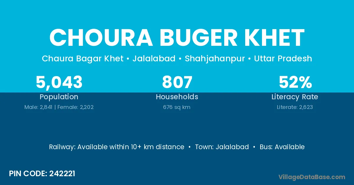 Choura Buger Khet village has a total population of 5,043 people, of which 2,841 are males and 2,202 are females.