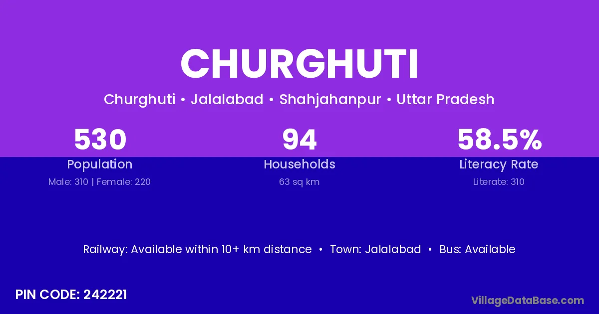 Churghuti village has a total population of 530 people, of which 310 are males and 220 are females.