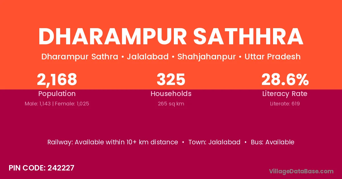 Dharampur Sathhra village has a total population of 2,168 people, of which 1,143 are males and 1,025 are females.