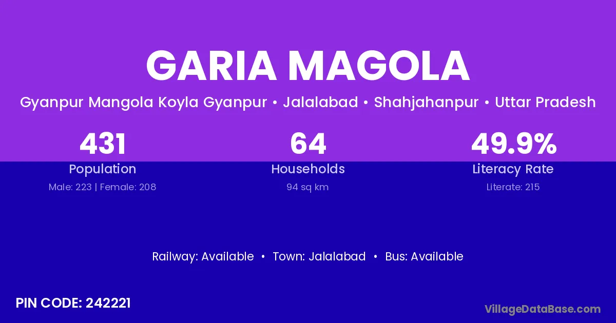 Garia Magola village has a total population of 431 people, of which 223 are males and 208 are females.